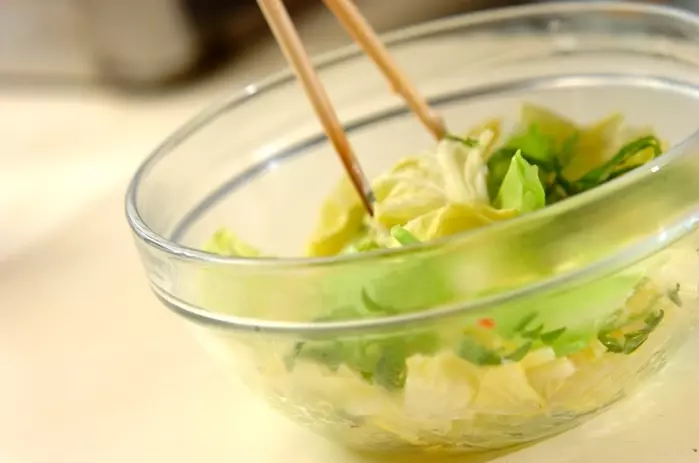 1. 春キャベツを耐熱ボウルに入れ、ラップをかけ、電子レンジで約1~2分キャベツがしんなりするまで加熱する。
