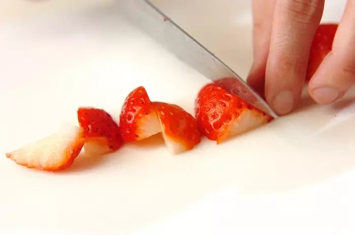 イチゴは水洗いして水気を拭き取り、ヘタを取って4等分に切り、マシュマロは1cm角に切る。