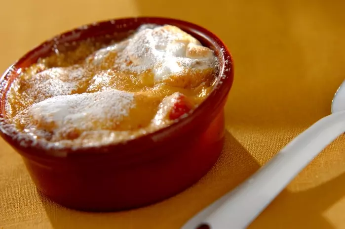 2. 耐熱容器にイチゴ、マシュマロを並べ、(1)を入れて200℃に予熱したオーブンでこんがり焼き色がつくまで焼く。