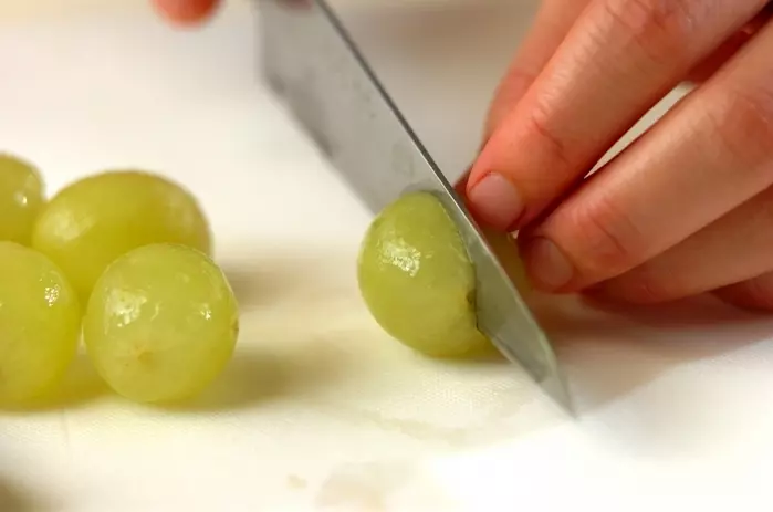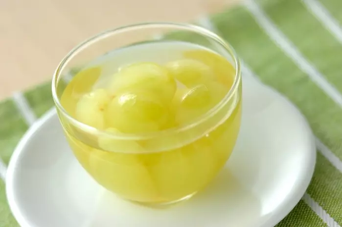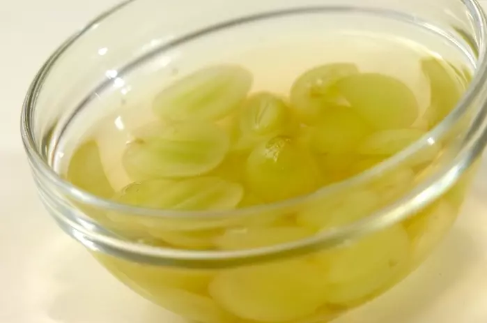 1. <白ワインシロップ>にマスカットを浸し、冷蔵庫で1時間ほど置く。