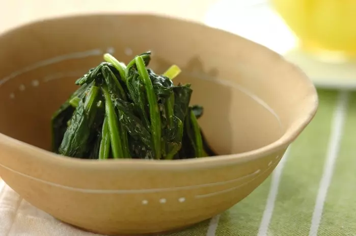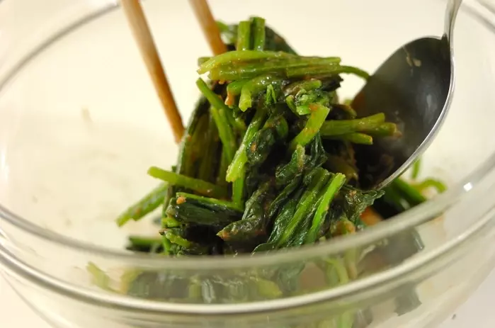 1. ボウルで<ゴマダレ>の材料を混ぜ合わせ、ホウレン草を加えて和え、器に盛る。