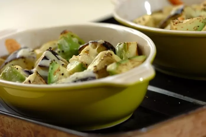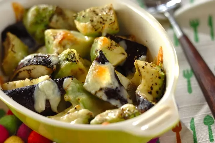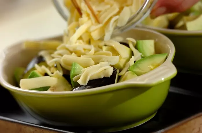 1. 器にナスとアボカドを入れ、オリーブ油をかけ、ピザ用チーズ、塩、粗びき黒コショウをのせる。
