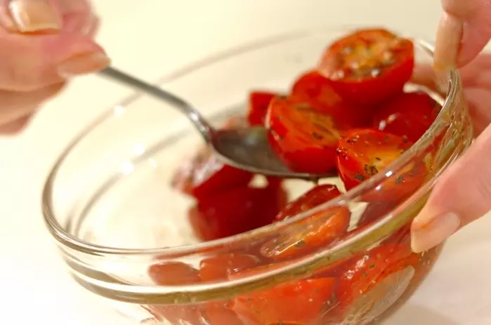 4. <C>のプチトマトは横半分に切り、その他の材料と合わせる。バゲットの上にのせ、器に盛る。