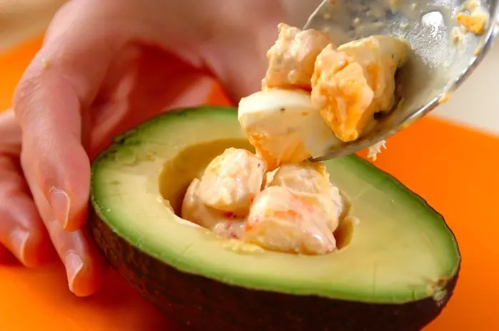 2. アボカドは半分に切って種を除き、空いた穴に(1)の材料をのせ、器に盛り付ける。