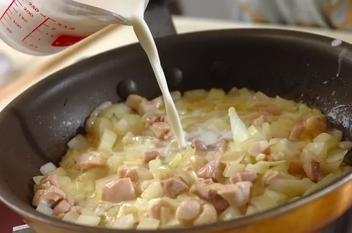 1. バターを温めたフライパンで鶏もも肉、玉ネギを中火で炒める。火が通ったら、<調味液>の材料を加え、弱火でトロミを付ける。
