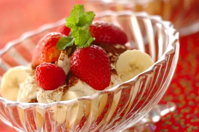 4. 一番上にイチゴとバナナとミントの葉を飾る。
