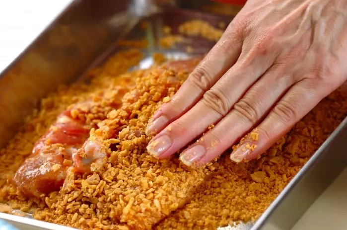1. 鶏もも肉に塩、粗びき黒コショウで下味を付ける。<衣>にくぐらせ、コーンフレークを付ける。