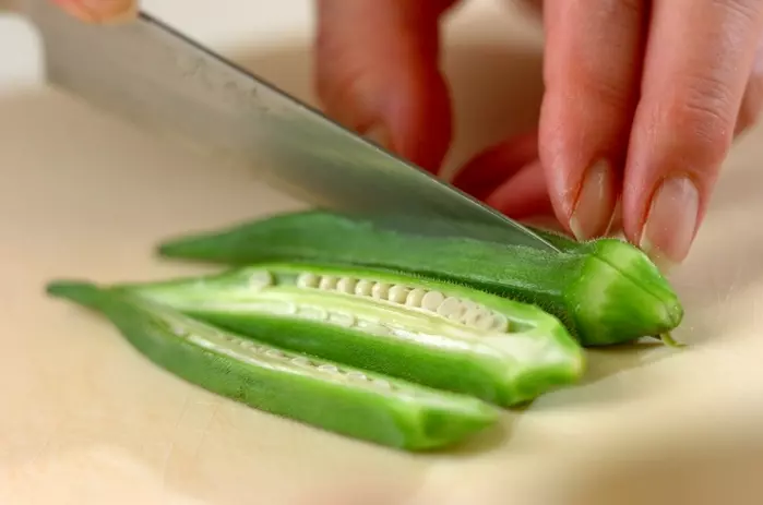 オクラは熱湯を沸かした鍋に分量外の塩少々を入れ、強火で1分程ゆでて冷水にとり水気を切って、縦半分に切る。<ドレッシング>の材料をよく混ぜる。