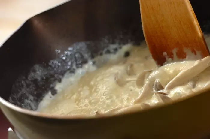 3. フライパンにバターを入れて火にかけ、シメジを入れてしんなりするまで炒める。<ソース>の材料を加えてトロミがつくまで中火で煮る。