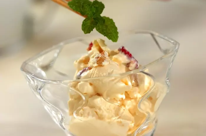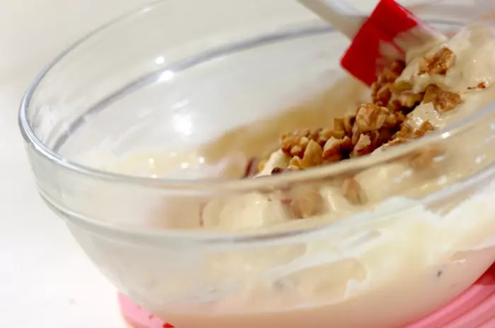 2. <調味料>の材料を泡立て器またはハンドミキサーで角がたつくらいまでホイップする。バニラアイス、クランべリー、クルミをザックリと加え、冷凍庫で冷やす。