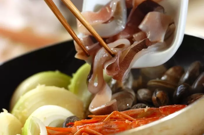有頭エビは殻付きのまま背ワタを取り、よく洗う。アサリは砂出しをし、よく洗う。イカは幅1cmの輪切りにする。玉ネギは6等分のくし型にする。ニンニクはみじん切りにする。