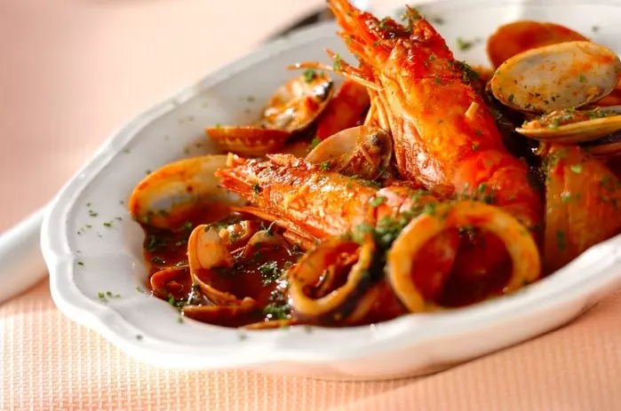 1. フライパンにオリーブ油とニンニク、玉ネギを入れて弱火で熱し、香りがたってきたら、有頭エビ、アサリ、イカを中火で炒める。