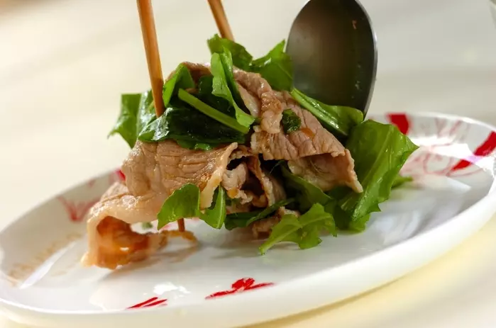 1. 鍋にたっぷりの湯を沸かし、酒を入れて火を止める。豚肉を入れて菜ばしで広げ、余熱でしゃぶしゃぶと火を通す。