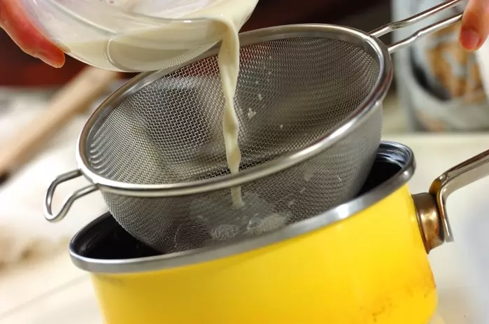 ボウルに全ての材料を入れ、1分置いたら混ぜ、網に通して鍋に移し入れる。