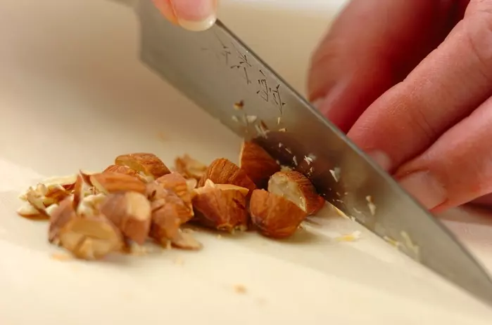 ボウルで<調味料>の材料を混ぜ合わせる。アーモンドは粗く刻む。紫玉ネギは縦に薄く切る。プチトマトはヘタを取り、横半分に切る。