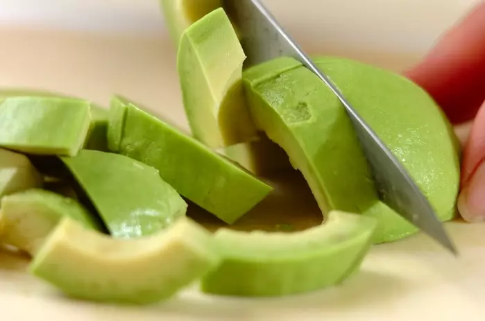 2. アボカドは種を取り除いて皮をむき、厚さ7~8mmのひとくち大に切ってボウルに入れ、塩、ゴマ油を加えて和える。