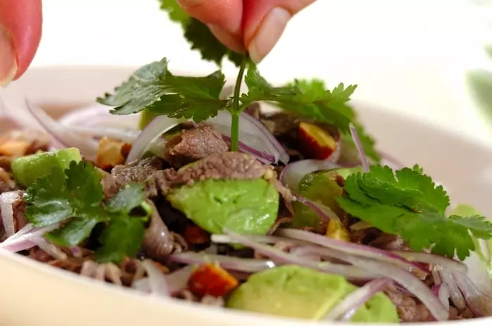 3. 牛肉は<調味料>で和え、(2)のアボカド、アーモンド、紫玉ネギを加えて合わせる。器に盛ってプチトマトを飾り、香菜を散らす。
