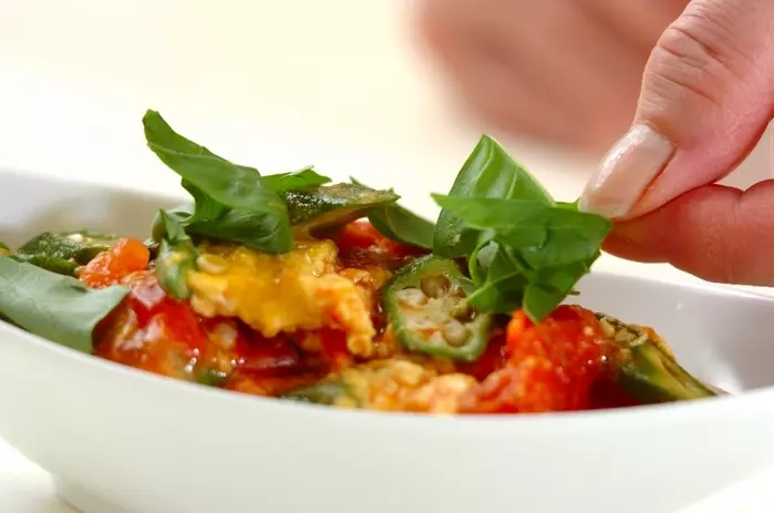 2. 火を強め、煮詰まったらオクラを加えて、塩適量で味を調え、<溶き卵>をまわし入れ、大きく混ぜて半熟に火を通す。