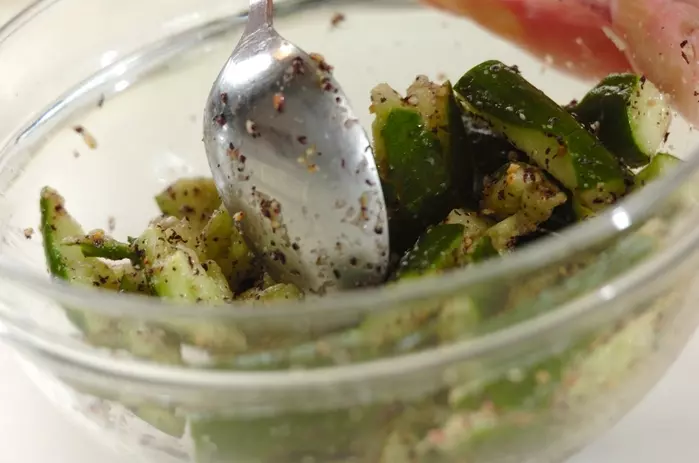 キュウリはすりこぎで叩いて割ることで味がよくからみます。