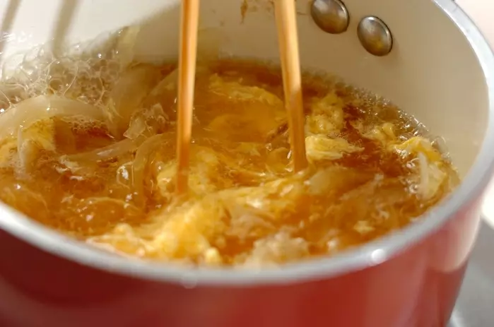 1. 鍋に玉ネギ、だし汁を入れて中火で熱し、玉ネギがしんなりしたら<調味料>の材料を加える。