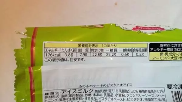 カロリーは1個あたり176kcal。たんぱく質3.8g、脂質7.9g、炭水化物22.8g、糖質22.2g。ピスタチオアイス、スポンジ生地の味わいを楽しめて、このカロリーはうれしい!絶妙なハーモニーを楽しめる