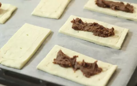 2)天板にオーブンシートを敷いて1)を並べる。中央にチョコカスタードを塗り広げ、バナナの断面が見えるように少しずつずらしながら並べ、バナナの上にグラニュー糖をふる。(パイ1個にひとつまみ程度が目安)