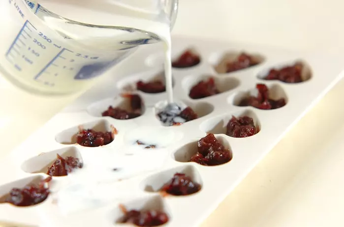 1、製氷機にゆで小豆を入れて牛乳を注ぎ、冷凍庫で冷やし固める。固まったら器に盛る。
