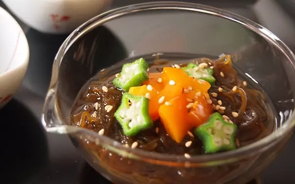 3、器に生もずくを盛り、昆布を取り出して<昆布三杯酢>をかける。プチトマト、オクラ、白ゴマをのせる。