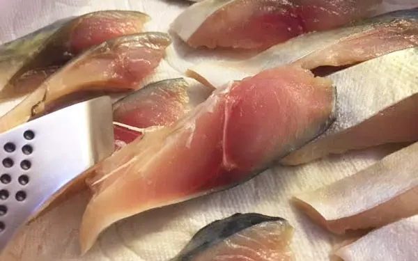 1、サバの切り身に残っている骨を指で確認しながら抜いていく。