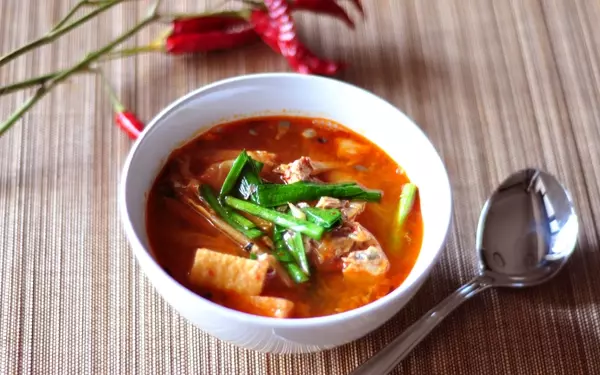 2、鍋に水を入れ、さば(缶汁ごと)、キムチ、1の材料を入れ、コチュジャンを溶き、沸かす。