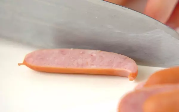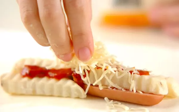 1、春巻きの皮に、フライドポテト4本、ソーセージ1本分、ピザ用ソース、ピザ用チーズをのせて巻き、<小麦粉のり>で留める(4本作る)。