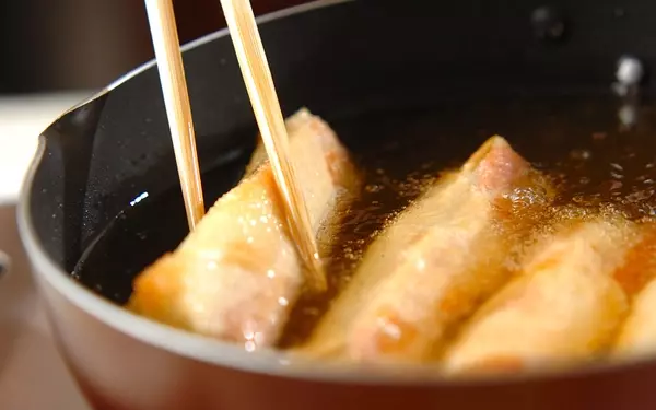 2、180℃の揚げ油に(1)を入れ、キツネ色に揚げて油をきり、プチトマトと共に器に盛る。