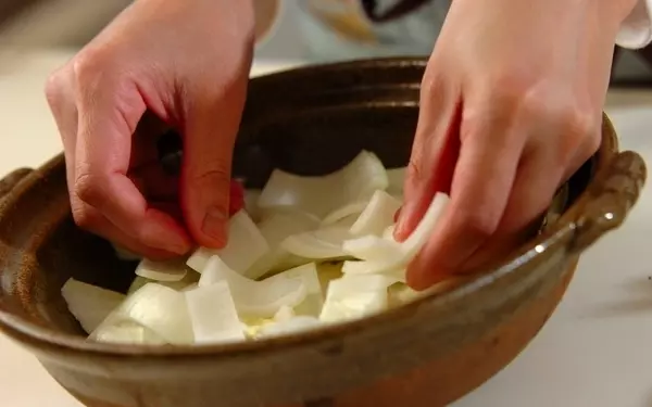 1、鍋に白菜の芯と玉ネギをしきつめ、混ぜ合わせた<合わせだし>の材料を入れて蓋をして煮込む。