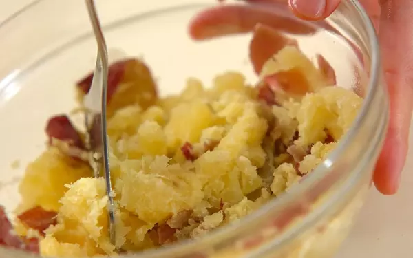 皮がついたままつぶしたほうが、黄色のなかに紫色が混じり、彩りよく仕上がります! チーズはお好みでいろいろな種類でアレンジしてみてもよいですね。