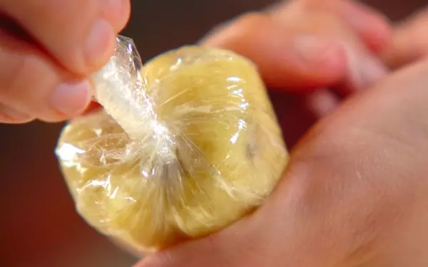 3、5mmの角切りにしたプロセスチーズを混ぜ、食べやすい大きさに分ける。それぞれラップで包み、絞るようにして形を整える。