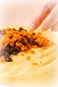 ケースを逆さに返して、生地を台に取り出し、レーズン、ニンジンの甘煮を混ぜ、生地の重量を計りカードで2等分し、更に3等分に分け、各々細長く伸ばす。