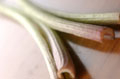 フキは葉が付いている場合は、葉を切り落して水洗いし、鍋に入る長さに切る。まな板に並べて塩を全体にかけ、塩が溶けるまで手のひらで転がす。熱湯に塩ごと入れ、煮立てば2分位ゆでて水に取り、粗熱が取れれば切り口から皮をむき、4cmの長さに切る。