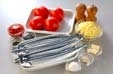 トマトはヘタをくり抜きフォークで刺して火で炙り、表面の皮が弾けて破れたら薄皮をむく。横半分に切って輪切りを2枚取り、残りはザク切りにする。(輪切りは8枚)