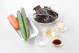 ワカメ、キュウリ、ニンジン、<合わせ酢>をサッと混ぜ合わせ、器に盛り付ける。