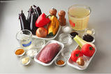 フライパン又は中華鍋にサラダ油を大3を入れ、強火にかけ豚肉を加え、色が変わってくれば、ナスを加え炒め合わせ、ナスに炒め色がつけば、3の煮込み鍋に加える。