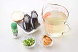 鍋にだし汁を入れて強火にかけ、煮たったらナス、玉ネギを入れる。