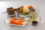 干しシイタケは水で柔らかくもどし、軸を切り落として、傘を半分に切る。もどし汁は網を通し、300mlに足りない場合はだし汁、又は水を足す。