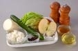 器に水気をしっかり切った野菜、リンゴ、カッテージチーズを盛り合わせ、レーズンを散らし、合わせた<ドレッシング>を掛けていただく。