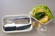 <春キャベツのもみ漬け>を作る。ビニール袋に春キャベツ、大葉、塩を入れ、袋に空気を入れて袋の口を持ちながら振って塩を全体に絡ませる。塩が全体に絡まったら空気を抜き、はじめは(袋ごと)優しくもむ。少ししんなりしてきたら、少しずつ力を強くしながらもみ、袋の空気を出して口を縛って10分おく。