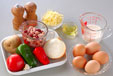 ピーマン、赤ピーマンは縦半分に切ってヘタと種を取り、玉ネギに合わせて切る。