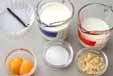 小鍋に生クリーム、牛乳、バニラビーンズを加えて中火にかけ、煮立つ直前に火を止める。1のボウルに少しづつ加え、泡立てないように混ぜ合わせ、一度網を通しておく。