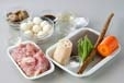 干しシイタケはぬるま湯でもどし、石づきを落として半分に切る。戻し汁は網を通し、300mlに足りない場合はだし汁、又は水を足す。
