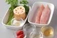 • レンコンは皮をむき薄い輪切りにして酢水に放つ。