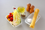 フライパンにオリーブ油、ニンニクを入れて弱めの中火にかける。香りが立ってきたらプチトマトを加えてサッと炒め、刻み赤唐辛子、アンチョビを加えて炒め合わせる。