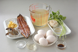 器に飾り用の具を残し、他の具を分けて入れ<卵液>の2/3量を注ぎ、湯気の上がった蒸し器に入れる。乾いたタオルを蒸し器の蓋に巻き付け、少しずらして蓋をし、強火で2分、中火にして5~6分蒸す。